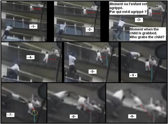 Le voisin a alors parlé à l'enfant et l'a rassuré. L'enfant a pu mettre ses pieds dans l'espace situé sous le garde corps, sur le plancher en béton. Il a commencé sa progression en direction du voisin. Le voisin guidait alors l'enfant en toute sécurité. Evidemment, plus il se rapprochait du voisin , moins il courait de risques. Au bout de 13 secondes exactement à partir du moment où l'enfant est agrippé, le garçon arrive à la hauteur du voisin prêt à être hissé. Il est alors en sécurité à 100% puisque le voisin est en position idéale pour le maintenir même si il glissait et tombait. C'est alors que Mamoudou qui se trouve un peu loin, assis à califourchon sur le garde corps, se rend compte que l'enfant est sécurisé et que son action n'a servi à RIEN. Il se penche brusquement, il tend le bras pour attraper l'enfant. Le corps et le bras de l'escaladeur-capteur d'enfant sont alors à l'horizontale, c'est à dire dans la pire des positions pour soulever une charge. Il arrache littéralement l'enfant par le bras gauche. Il devient le héros national et international !!!!!!