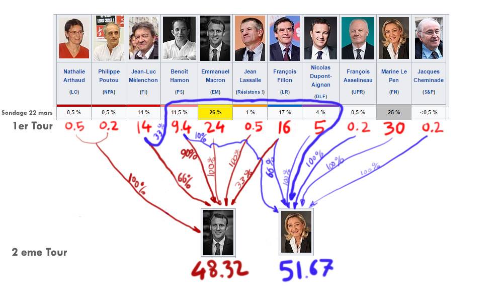 Je pense que l erreur dans ton pronostic concerne ceux qui ont voté Fillon. Je vois plus 66% voter pour Macron et 33% pour MLP. Donc Macron serait toujours élu mais sur une courte tête.