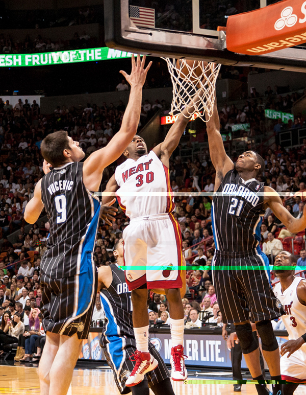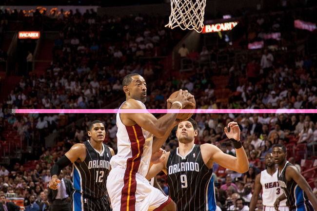 Ah, un connaisseur! J'ai été contraint de prendre mon 24-105, si j'avais pu, j'aurais pris mon 70-200 f2.8 (et mon 1D mak 3 au lieu de mon 5D). Mais en tant que spectateur, on a pas le droit de rentrer avec n'importe quel matériel photo dans l'American Airlines Arena. Finalement à f4, ça passait, j'étais à 1600 isos et au 1/400ème (j'aurais préféré être au 1/600ème). J'ai fait toutes ces photos en RAW, ce qui permet de bien augmenter la luminosité et de réduire le bruit sous Lightroom 4. Ce que j'ai le plus regretté c'est la qualité du viseur et de l'autofocus du 5D par rapport au 1D, ce qui fait que j'ai eu beaucoup de déchets.
